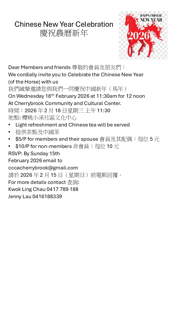 In order to improve the efficiency of managing the Cherrybrook Chinese Community Association Inc., the Management Committee convened on 23 September 2017, have decided that all sub-groups’ (including Seniors Group) activities will now be directly managed, coordinated, organised, facilitated and financed by the Management Committee.